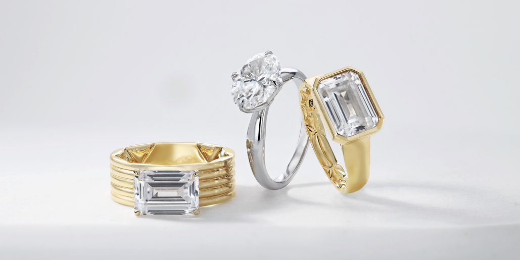 An emerald cut feels right at home in an east-west setting. This layout emphasizes the stone’s long, parallel lines and “hall-of-mirrors” facets, drawing the eye across the hand and letting those reflective lines shine in a fresh, unexpected direction.