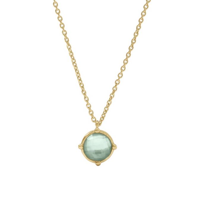 A faceted gemstone enhanced with four golden beads, dangling from a delicate cable chain.