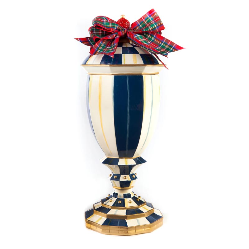 The Medium Royal Check Lidded Urn is a delightful dose of blue. Embellished with hand-painted Royal Checks and Stripes, its removable lid is topped with a faux red cinnabar bead and red tartan ribbon. Display it with the Small and Large Royal Check Lidded Urns to create a grouping that adds drama and dimension to your decor.