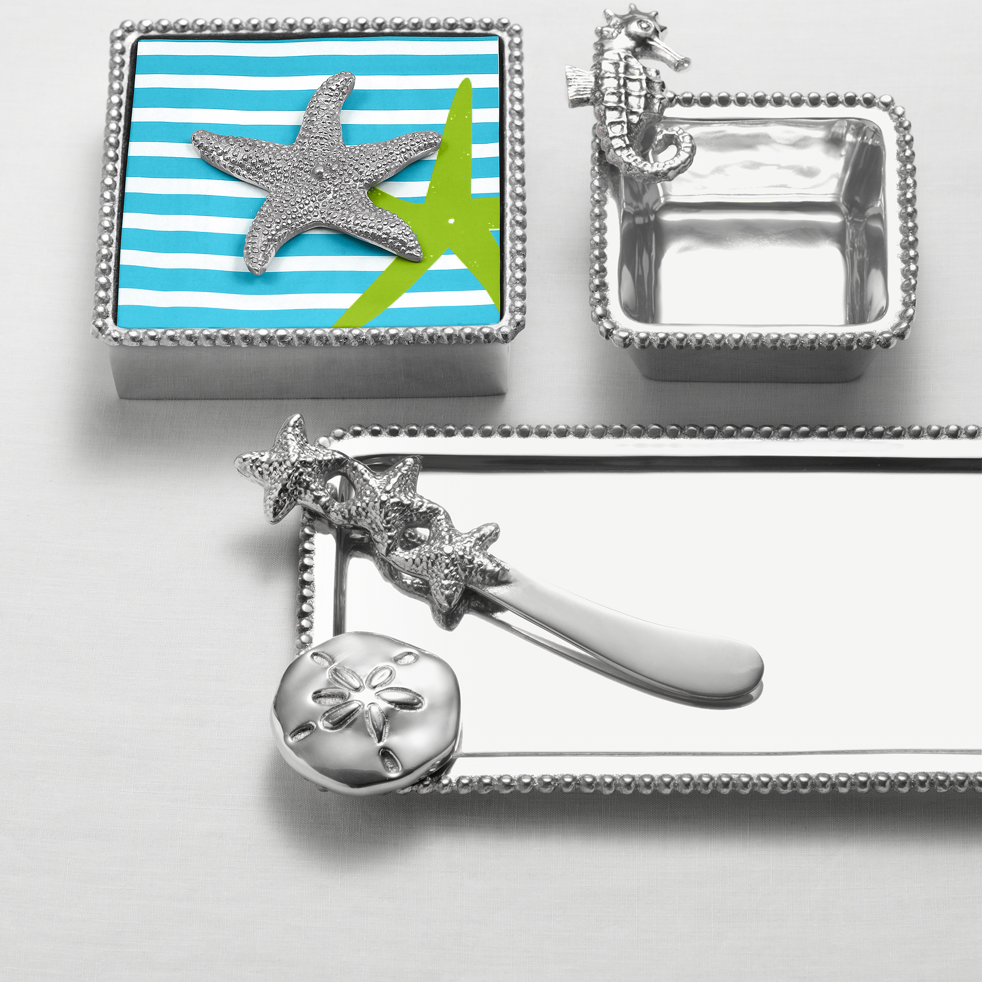 Mariposa Beaded Long Rectangular Tray is an expanded addition of the popular Beaded Statement Tray. This larger size is at home in nearly any setting. Add it to the table with rows of nibbles, to the dresser top with a line of delicate perfume bottles, or even in the bathroom as an elegant way to display grooming products.