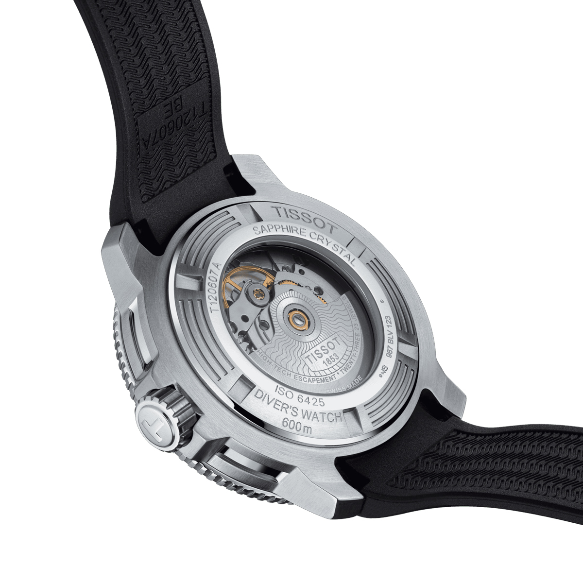 This Tissot Seastar 2000 Professional Powermatic 80 watch features a rubber band, making it ideal for everyday wear. The Tissot family of dive watches welcomes a new, advanced, technical version, the Seastar 2000 Professional. Its profile ticks every box for a high performance watch: water resistant to 600 metres, helium valve, ISO 6425 certification, automatic calibre with longlasting power reserve, ceramic bezel. With its wave patterned, shaded black dial and its uncompromising design, it is also a timepiece aimed at enthusiasts of extreme nautical style.